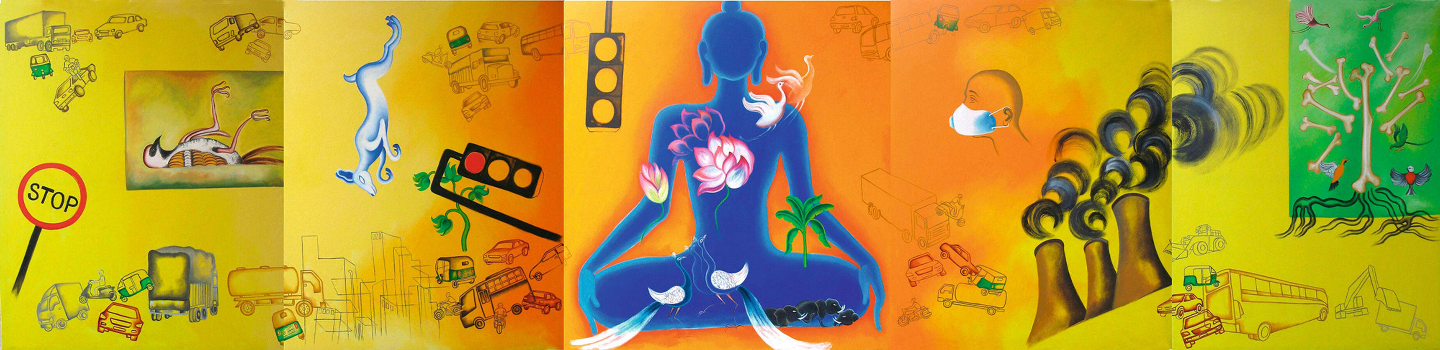 Caur comes from a Sikh family who fled the Pakistani West Punjab to the Republic of India in 1947 during the partition. Her mother is a writer and exposed her to many different art forms as a child, of which painting was her favorite. Caur has since created work in many different mediums, including murals, oil paintings, installations, paperwork, sculptures, and book illustrations. Her first painting, “Mother and Daughter,” was influenced by Amrita Sher-Gil, an influential contemporary, female, avant-garde artist. She also draws from Punjabi literature and Indian folk art, and touches on gender, race, environment, violence, life, and death in her work.