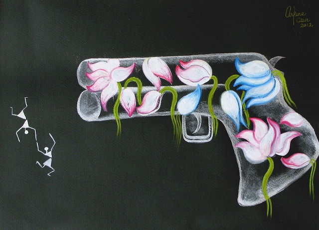 Above is a collection of Arpana Caur’s drawings on paper. She depicts non-violent images, such as Gandhi, and a gun with flowers over it. Gandhi fought to stop anti-Indian legislation and pushed to create a society where violence was never the answer, and people created sustainable and ethical compromises that didn’t involve fighting each other. These drawings show her devotion to building a better world and use images of pivotal figures, such as Gandhi, to evoke emotion and recognition through her artwork.